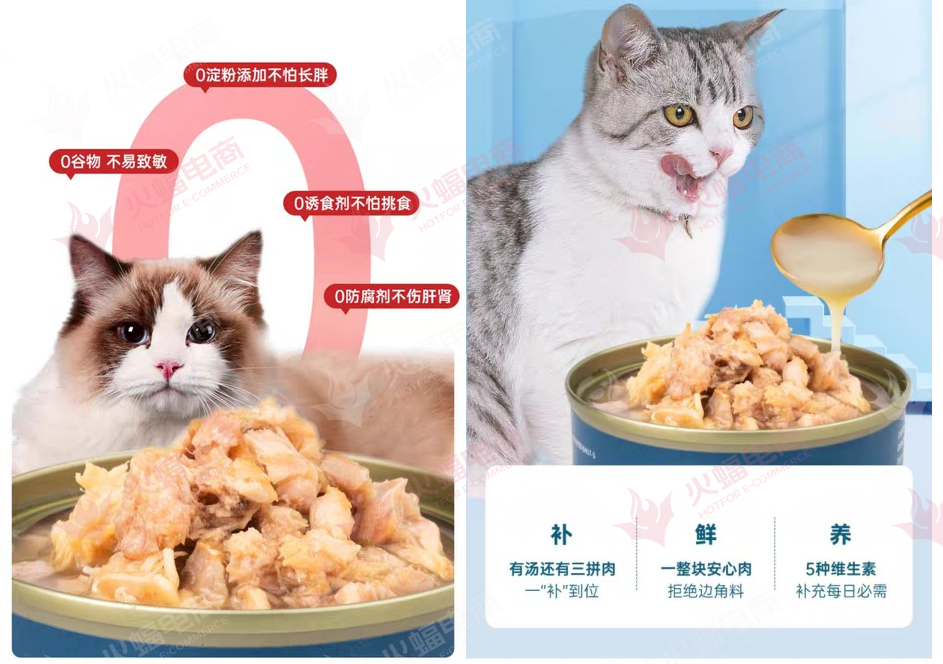 團(tuán)隊結(jié)合市場,錨定品牌方初期的核心目標(biāo)受眾為90后年輕新養(yǎng)寵人群。在視覺上,不過度追求精美的效果圖,走差異化路線,以更落地的方式呈現(xiàn)每一款產(chǎn)品。用「勺子」「汁水」以及貓咪「舔舌」的本能反應(yīng)等一系列元素,將天然、新鮮的品牌印象直觀地傳達(dá)給消費(fèi)者;在產(chǎn)品上,以「0防腐劑」「0淀粉」展現(xiàn)天然原材,以添加「?;撬帷埂溉~酸」「益生元」凸顯營養(yǎng)豐富,以「專家團(tuán)隊」「資質(zhì)認(rèn)證」作為信任背書。如此通過產(chǎn)品+視覺雙驅(qū)動,來鞏固「懂貓愛貓」的輕奢貓品牌的形象定位,滿足寵物主精細(xì)化喂養(yǎng)需求。在雙方配合下,截至發(fā)稿日,該寵物品牌天貓旗艦店粉絲已突破24萬。